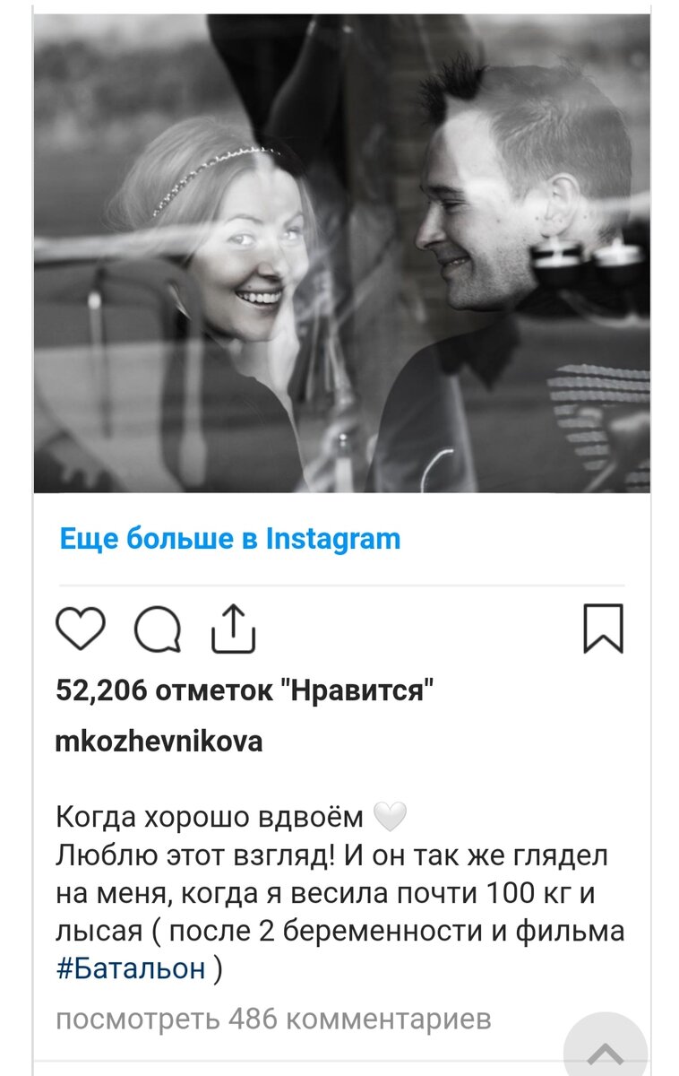 Мария Кожевникова поделилась редким снимком со своим мужем. И рассказала об их отношениях. В отличие от многих 24 часа рядом в режиме самоизоляции супругов не рассорили, а только сблизили. "Когда хорошо вдвоём! Люблю этот взгляд! И он так же глядел на меня, когда я весила почти 100 кг и была абсолютно лысая (после второй беременности и фильма «Батальон»)» — с гордостью призналась подписчикам актриса. Когда поклонница прокоментиравола пост Мария сказала. «Это я переживала, а он так глядел на меня и так оценивал всегда!» Мария поделилась жизнью на карантине и говорит что на карантине очень опасно находится рядом с холодильником, боится сильно понравится на карантине, сказала Мария. Для фигуры карантин опасен. «Холодильник в изоляции — опасная штука. Я очень сильно поправилась! Пятая точка растет не по дням, а по часам. Попробовала примерить платья — ни в одно не влезаю! Не прохожу в бедрах. Но все мы родом из детства. И все, чего мы были лишены тогда, добираем сейчас. Если я увижу хле