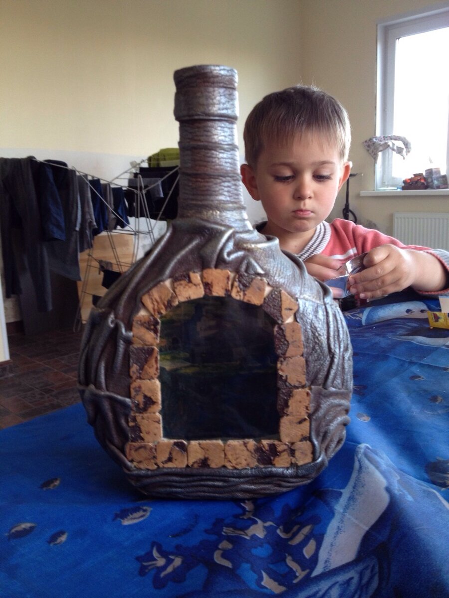 Довольно часто сталкиваюсь с проблемой - что дарить мужчине. Каждый раз - головная боль. Но с некоторых пор для меня вопрос решается довольно просто: красиво оформленная бутылка хорошего алкоголя. Это может быть и самостоятельный подарок и как часть подарка - зависит от ваших возможностей и повода. Декупаж - весьма распространенная техника, только ленивый, наверное, еще не попробовал. Мне нравится работать с кожей. Эффект классный, материал не дешевый, смотрится достойно, не стыдно такое дарить, может служить в качестве графина долгие годы. Источник кожи - старые сумки, сапоги, куртки, перчатки. Иногда и сами аксессуары от сумок тоже использую. Сегодня я покажу несколько вариантов как пример. На самом деле вы можете лучше - я уверена. Для работы нужна бутылка. Ее замачиваю в теплой воде и потом снимаю этикетки. Просушиваю, обезжириваю (спирт или бензин). Клей использую момент из Фикспрайса - удобная маленькая бутылка, сохнет оптимальное время - успеваю все выложить и задрапировать и к