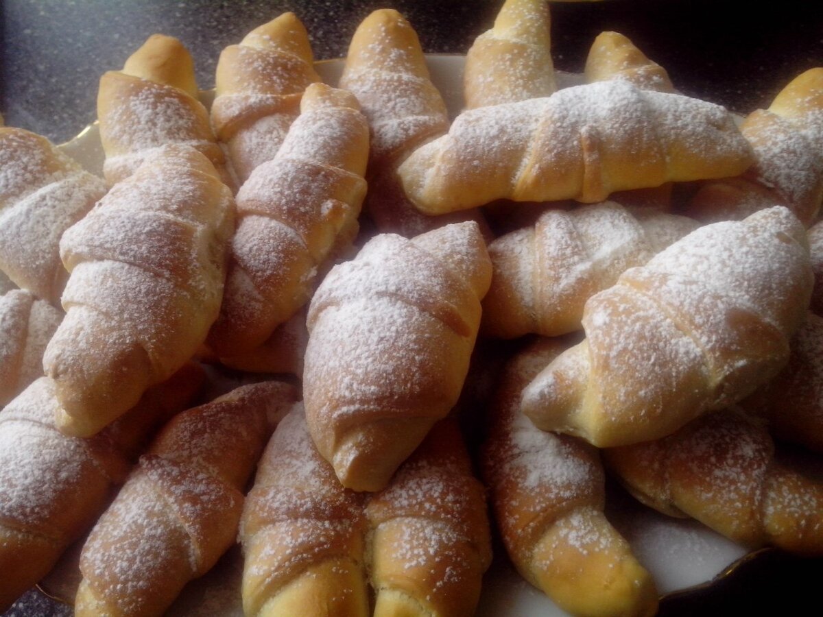 Для теста: Дрожжи - 1 пакетик или 100 г свежих. Молоко - 250 мл. Сахар -1 ст.л Мука - 3 ст.л Сливочное масло - 2 пачки. Яйца - 3 шт. Ванилин - по вкусу. Для начинки: Грецкие орехи,молотые - 1 ст. Сахар - 1 ст. Яичный белок - 1шт. Приготовление: Для начала нам нужно развести опару для теста: Смешиваем дрожжи,молоко(теплое),муку и сахар и отставляем на 15-20 минут. Соединяем растопленное масло,яйца,ванилин и дрожжевую смесь. Вливаем в муку и замешиваем тесто,добавляйте муки на глаз,сколько возьмет тесто.) Оставляем тесто в теплом месте на 1.5-2 часа. Приступаем к начинке,орехи смешиваем с сахаром,добавляем взбитый белок,аккуратно перемешиваем) Раскатываем тесто,режим на треугольники,кладём начинку и закручиваем от себя.) Выпекаем в духовке 30 минут,при 180 градусах. Рогалики готовы,всем приятного аппетита!)