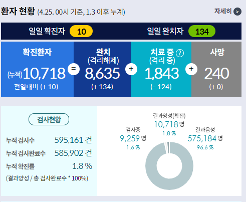 Всем добрый день! Давно не было новостей из Южной Кореи о коронавирусе или короне (как вирус называют во многих странах). Во-первых, не хочется постоянно писать о негативе, и о том, о чем в принципе даже стены уже говорят. Во-вторых, в Корее всё настолько наладилось, что порой и вовсе забываешь, что в мире пандемия. Но тем не менее, вирус есть и расслабляться не стоит! Итак! За последние сутки в Корее +10 новых заболевших и +134 выздоровевших. Летальных случаев нет! Из 10 заболевших 4 человека приехали из заграницы, так что по факту в самой Корее всего 6 новых случаев. За всё это время в Корее проведено 595,161 тестов на вирус, из них 96,6% дали отрицательный результат. Теперь вы понимаете, насколько массово проводились тесты?! Тест на вирус брался и берется не только у тех, у кого есть симптомы вируса, кто был в странах с эпидемией. Тесты на вирус делали всем тем, кто возможно сталкивался с заболевшим, или был в том месте, где был заболевший. Ну и конечно же, желающие сдать анализы т