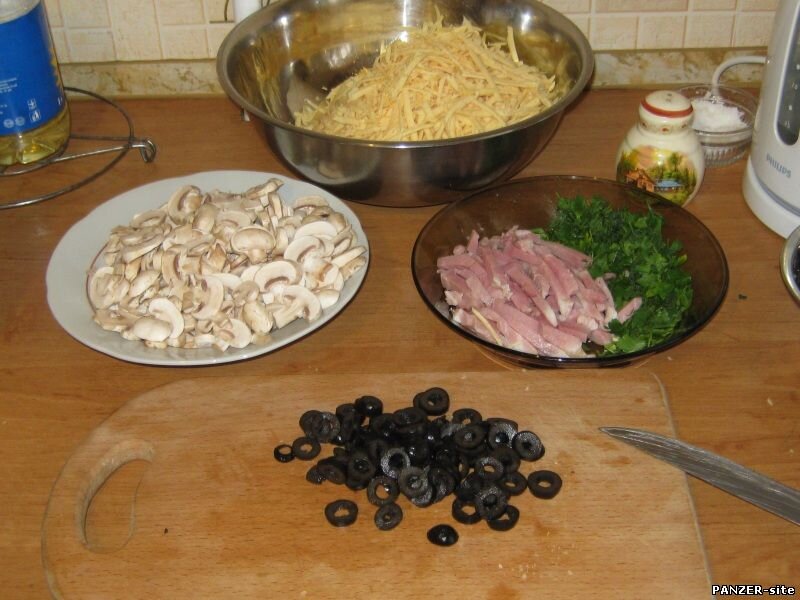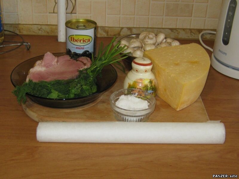 К сыру, ну или в данном случае, сырному продукту, докупил маслин, балыка, зелени, шампиньонов. Ну, соль-перец в наличии имелись. На первом этапе следовало все измельчить.