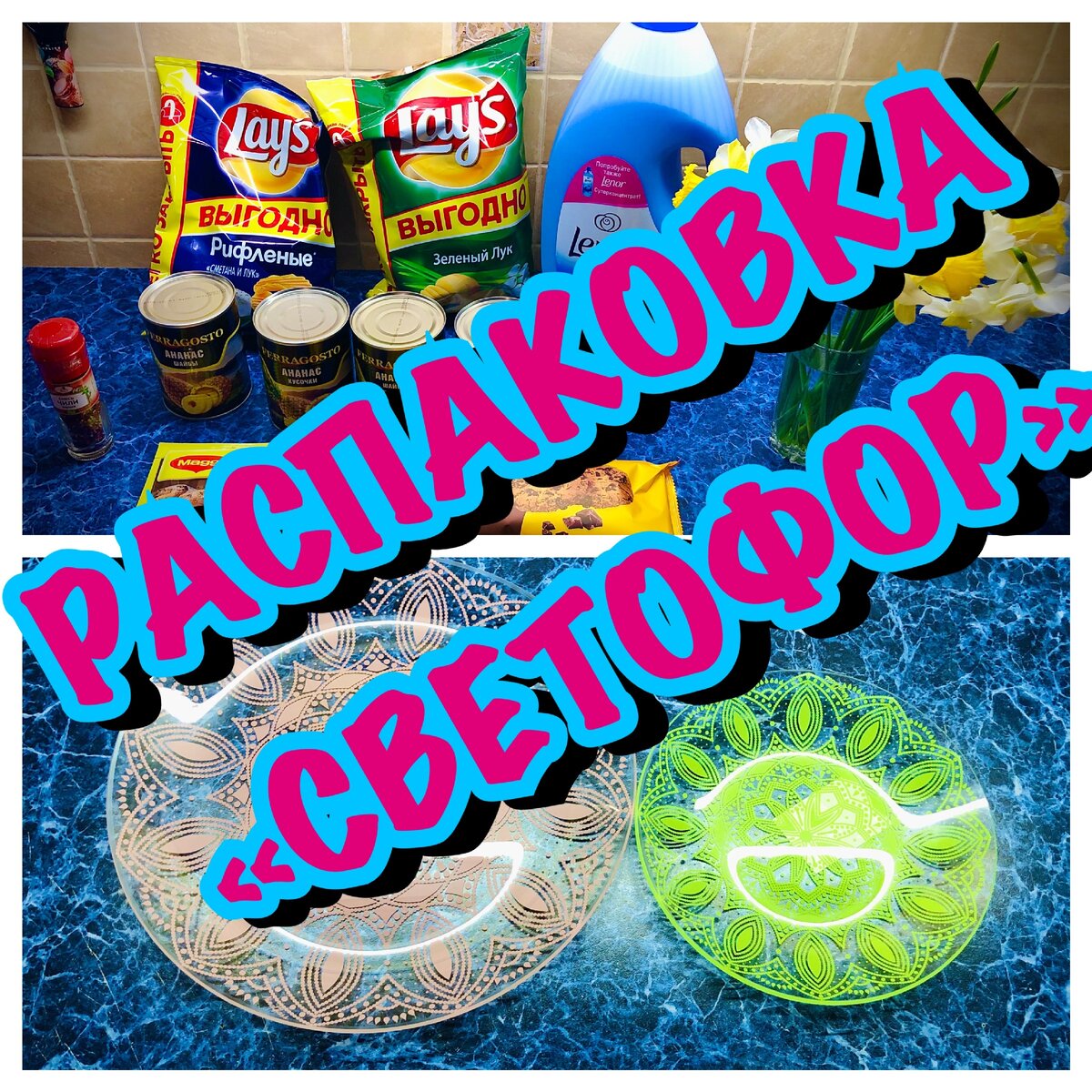 Всем привет! С Вами Ася и сегодня мы с Вами проведем РАСПАКОВКУ с магазина "СВЕТОФОР". Что же я там купила и по каким ценам? Сейчас расскажу! Начнем по порядку: 1. Чипсы Lays - рифленые со сметаной и луком и обычные с зеленым луком. Цена - 80 рублей за пачку 225 грамм. Очень выгодно. В других магазинах цена -за такую пачку составляет около 150 рублей. 2. Смесь перцев чили - 40 рублей. Думаю, это очень хорошая цена. 3. Ананасы кольцами и шайбами. Всегда покупаю их только там! Цена составляет 47 и 49 рублей за среднюю баночку. 4. Lenor - концентрат 4л-186 рублей. Очень выгодная покупка, а пахнет - просто обалденно. И самое, главное, хватает на долго и запах с белья не выветривается, даже после сушки. 5. Приправа Maggi для курочки с чесночком. Стоимость - 19 рублей ! Это просто находка, поскольку такая приправа в других магазинах составляет все 40 рублей. 6. Печенье Яшкино с кусочками глазури. Печенье очень вкусное и по вкусной цене - 33 рубля. 7. Блюдо с розовым орнаментом - 79 рублей