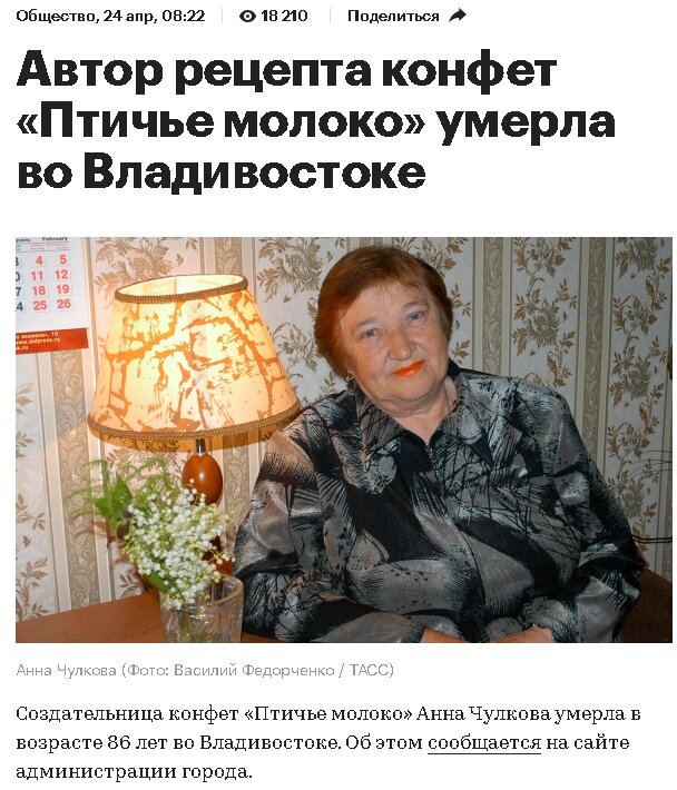 Новости.Во Владивостоке на 87-м году жизни скончалась создатель знаменитых конфет "Птичье молоко" Анна Чулкова.