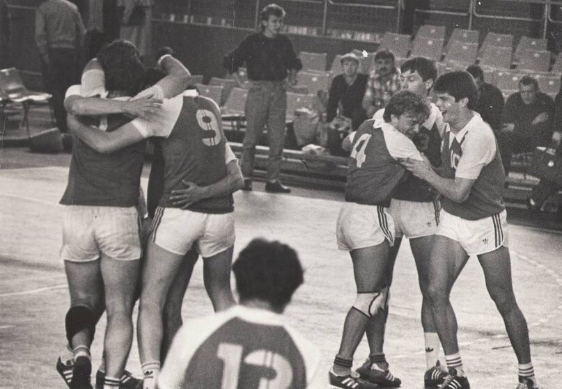 Этот снимок сделан в Минске 16 июня 1990 года. Мгновением раньше прозвучала сирена второго суперфинального матча чемпионата СССР. Радуются астраханские динамовцы, впервые ставшие чемпионами страны.