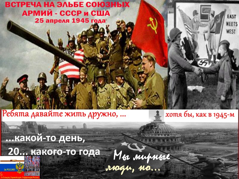 75 лет - 25 апреля 1945 года, разгромив нацистских еврофашистов , встретились на Эльбе два настоящих союзника... два солдата... Советский и Американский... а сегодня они не союзники, сегодня они "партнёры", очень похожие на германию образца 1940 года... конечно , "если враг захочет нас сломать", то как и всегда он будет разбит, и Победа будет За Нами... хотя лучше просто жить в мире, заниматься Развитием, на Благо Людей...