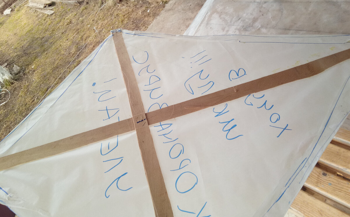 На трудах сказано дистанционно на удалёнке сделать змея воздушного. Делать как сделали все – бумажный, как самолётик и выслать фото училке. Ну обман просто. Решили сделать из того что есть в хозяйстве. Попроще и быстрей. Но по настоящему. Делаем. Был на чердаке шпон. Можно тоненькие рейки, но шпон вообще легкий. Отрезали его. Схемку накидали. Крест соединили, клей и степлер. Дырочки – равноудалено. В них леску по схеме. Всё сводится к центральной леске. Основу можно из плёнки или какого лёгкого материала. Была калька-очень лёгкая и прочная. Когда бежишь и ветер нагоняешь –взлетает, парит, но потом закрутится и вниз. А так ветра не было. Но не порвался. Трудовик доволен фото (а может ему пофиг). Лежит до лучших времён.