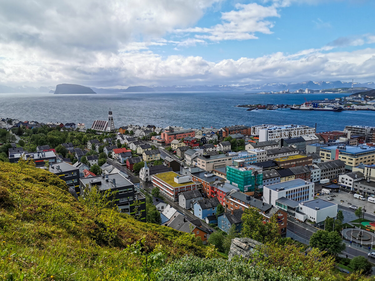 Времени на знакомство с Хаммерфестом было не очень много, но я всё успел. Я забежал на горку, чтобы собрать рюкзак и палатку. На ход ноги небо немного расчистилось от облаков и дождь закончился. Мне осталось ознакомиться с ещё одним объектом перед тем как выйти на трассу из города. Вы уже привыкли, что я пишу о всяких буддийских местах по всему миру, но в Скандинавии не так много буддийского, поэтому я иногда буду писать о христианских церквях. О церкви в Киркенесе я уже писал. И про пару-тройку церквей в Баварии тоже (Ландсхут, Штраубинг, Пассау 1, Пассау 2). А, совсем забыл, про древнейшую христианскую церковь в Китае тоже писал. И про храмы в провинции Юннань оказывается тоже. И про храм в Бурятии... Так что не так уж и мало, просто непривычно всё ещё. Я пошёл вниз по тропе под рюкзаком к архитектурной доминанте на горизонте, к Hammerfest kyrkje. Церковь Хаммерфеста (норв. Hammerfest kyrkje) — приходская лютеранская церковь в городе Хаммерфест провинции Финнмарк, королевство Норвег