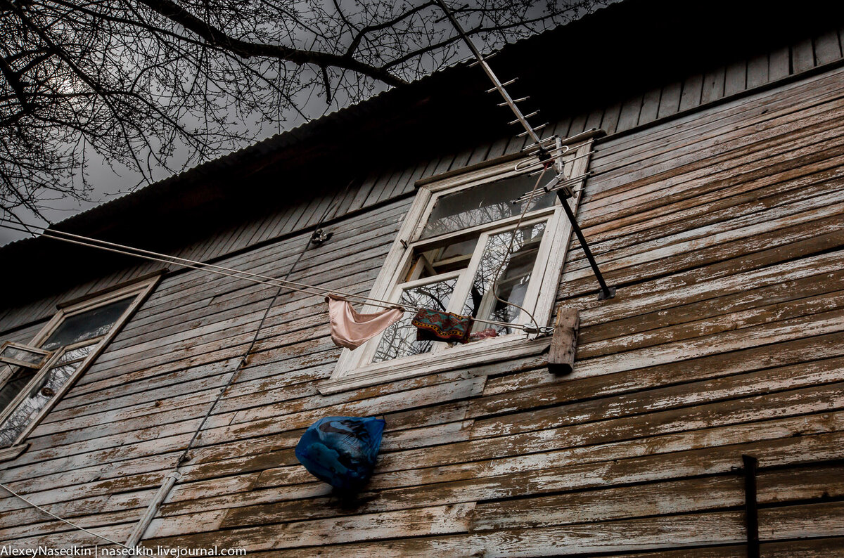 Однако не тут-то было. Поначалу можно предположить, что данный чудесный пейзаж принадлежит Мурманской или Архангельской области, но... Это Подмосковье, причём ближнее. Добро пожаловать в Апрелевку - городок на престижном юго-западном направлении. Совсем рядом из Внукова отправляются важные правительственные рейсы с надписью "Россия" на ливрее лайнера, а холопы вынуждены довольствоваться куда большей прозой жизни. Да-да, это самый настоящий барак, а на дворе, на секундочку, XXI век.