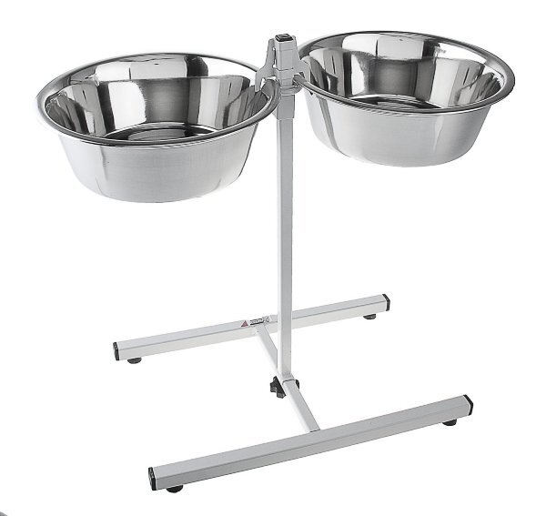 Миски на стойке либо подставке. Очень удобно регулировать высоту мисок с помощью крепежа. Особенно это важно для щенков, в период роста т.к позволяет ему не горбиться, тем самым очень снижает риск формирования неправильной осанки. Плюс, если ваша собака после еды срыгивает, икает и кашляет - то правильное положение тела во время еды - решит эту проблему. Да и обеденное место вашего питомца сразу станет чище (под мисками не будет скапливаться вода и остатки корма). Важно: Ваша собака должна иметь постоянный доступ к воде на протяжении всего дня, а вот кормить ее лучше по часам.