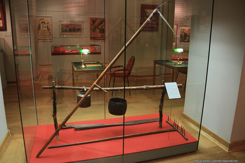 1. Предметы, которыми Ленин пользовался во время последнего подполья в 1917 году. В 1917 году, после расстрела июльской демонстрации, в печати появились заявления с обвинениями Ленина в государственной измене и шпионаже в пользу Германии. ЦК партии большевиков принял решение о переходе Ленина на нелегальное положение. Его укрыли в доме рабочего Емельянова на станции Разлив в 32-х километрах от Петрограда. Но после того, как рядом, в Сестрорецке начались обыски и аресты, место пришлось сменить. Н.А.Емельянов предложил поселить Ленина за озером Разлив под видом финского крестьянина. На небольшой, расчищенной от зарослей площадке был устроен "зелёный кабинет", где столом и креслом служили два чурбана. В свободное от работы время Владимир Ильич не упускал случая заняться физическим трудом: во