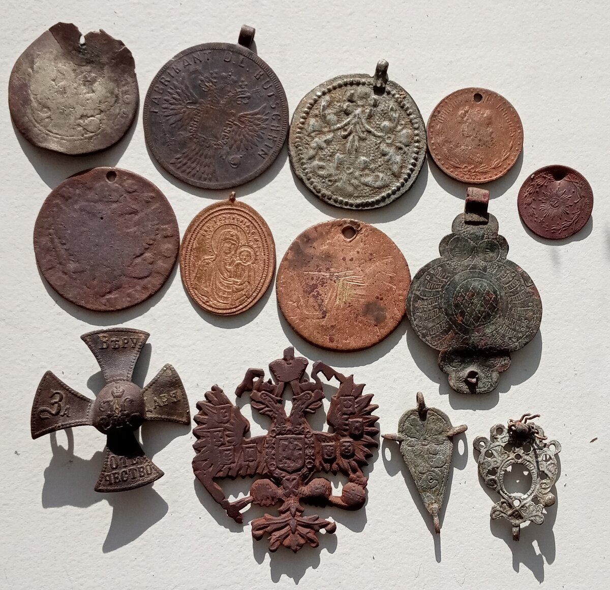 У любителей приборного поиска, наверняка, дома есть несколько емкостей для хранения находок. В одной - монеты. В другой, самой большой - всяческий шмурдяк, который жалко выбросить: "сдам потом в металлолом". А еще одна коробочка - со всякими ништяками, которые просто приятно перебирать на досуге. Помимо монет, хороший сигнал дают пробки и пуговицы. Начиная с пуговиц - гирек (приятная штука, часто бывают украшены рисунком), всяких фантазийных пуговок (в правом верхнем углу - пуговка с какой-то сурой на арабском). Ну, и конечно, пуговки РИА - иногда бывают настоящим произведением искусства. Нижние 2 пуговки слева - пуговицы чиновников. Одна - Вятской Губернии, другая с пушкой - Смоленской. Эти две пуговки с остатками родной позолоты так и манят начать собирать всю серию, но пока держусь... Пряги РИА... Зачетная и нечастая находка, особенно - если крепление целое. Почистил - и на ремень! Зачетной находкой считаются всяческие кокарды, ополченческие кресты, складни, иконки и другие пре