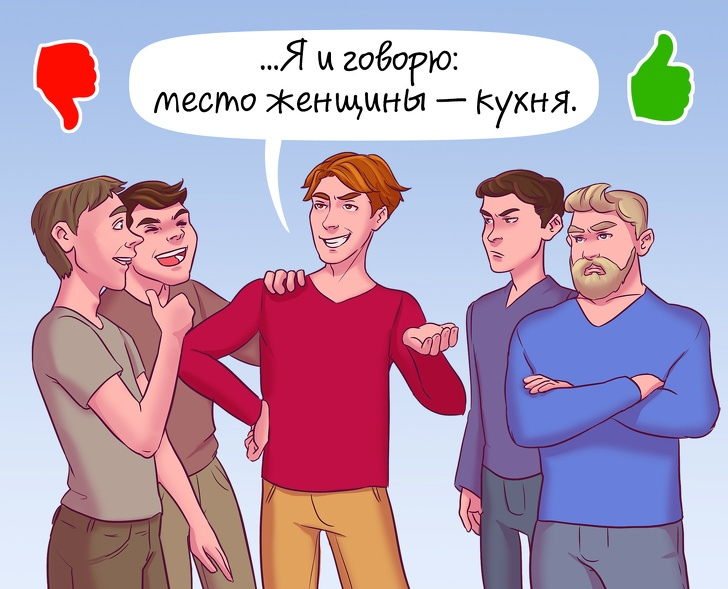 Сексизм настолько прочно укоренился в обществе, что иногда его сложно идентифицировать. Он присутствует во многих областях: в представлении об идеальной женщине и идеальном мужчине, уровне зарплат и даже шутках. Мы проанализировали, как может проявляться сексизм в повседневности и что можно сделать, чтобы уменьшить распространение этого явления. 1. Не поддерживайте сексистские шутки Листать ленту новостей в соцсетях, смеясь над мемами, — неплохой способ разгрузить голову и немного передохнуть. Иногда безобидные на первый взгляд картинки и шутки скрывают сексистский подтекст, а то и вовсе разжигают онлайн-травлю или кибербуллинг. Стоит ли поддерживать их лайками и репостами, коль скоро мы стремимся к взаимному уважению? То же самое касается подобных шуток и в офлайн-общении. 2. Выбирайте правильные выражения Стиль общения с детьми и фразы взрослых накладывают отпечаток на их дальнейшие взгляды, поступки. Разговаривая с ребенком, откажитесь от стереотипных, но опасных выражений: «т