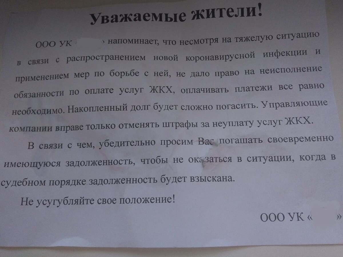 Вот такие объявления-предупреждения появились на дверях подъезда в нашем городе. Видимо уже массово перестали платить.И это в первый месяц самоизоляции.Кто-то говорит, что полгода не будут взыскивать пени за неуплату - поэтому не спешат с платежами, а многие просто не в состоянии -денег нет .Даже страшно представить, что будет впереди.Без работы,без денег - только на еду, и не у всех. Работники ЖКХ продолжают оказывать услуги - тепло-есть ,вода,электроэнергия- тоже.А дальше как? Долг платежом красен.