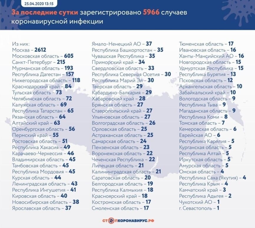 Москва. 24 апреля. INTERFAX.RU - В Москве за последнюю неделю резко возросло число летальных случаев среди пациентов с COVID-19, и в пятницу достигло 40 за сутки, сообщили в столичном оперативном штабе по контролю за коронавирусной инфекцией. Так, если до 16 апреля в Москве регистрировалось не более 14 смертей среди носителей инфекции, то с 17 апреля этот показатель стал превышать 20 в сутки, 22 апреля скончалось уже 27 пациентов, 23 апреля – 36, 24 апреля – 41. То есть, за неделю показатель смертности увеличился почти в два раза, подчеркивают в штабе. Первые два официальных случая смерти пациентов с коронавирусной инфекцией были зарегистрированы в Москве 25 марта. Самой молодой жертве COVID-19 в столице было 29 лет. Случаи инфицирования на 25 апреля: За последние сутки в России подтверждено 5 966 случаев в 83 регионах. В том числе выявлено активно как контактные и без клинических проявлений 2 915 (48,9%). Для сравнения: 24 апреля зарегистрировали 5848 случаев (максимальное количест