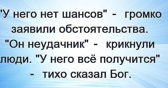 Не получается.... Много причин почему.. а если честно какая разница, почему не получилось? Кому это важно... Когда мне говорят и объясняют почему. Я не могу понять зачем эти объяснение. Что они дадут человеку? Успокоение ?-вряд ли... Вопрос - что надо чтобы Получилось? - решает все.. Я не люблю жертву, не могу смотреть, когда человек опускает руки... Жить- это всегда вопрос КАК?!!!! Каждый день- новая страница в жизни, просто надо настроиться на этот вопрос. И ответ придет. Я готова к переменам. Я задаю себе вопрос КАК сделать так, чтобы твоя жизнь тебя устраивала.,.. что бы ни было ..КАК??? Основной вопрос и ответы приходят. Поверьте!