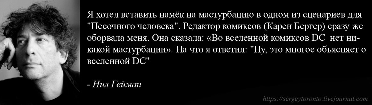 10 ноября 1960 Я хотел вставить намёк на мастурбацию в одном из сценариев для "Песочного человека". Редактор комиксов (Карен Бергер) сразу же оборвала меня. Она сказала: «Во вселенной комиксов DC нет никакой мастурбации». На что я ответил: "Ну, это многое объясняет о вселенной DC"