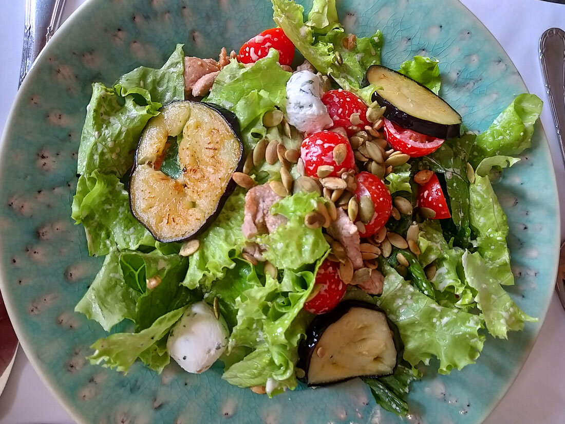 Теперь покажу несколько вариантов закусок. Баклажаны люблю в любом виде и часто заказываю их в ресторанах, в том числе в московских. Этот салат был приготовлен очень качественно и красиво подан.