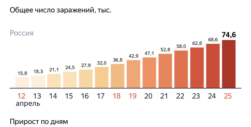 Статистика заражения коронавирусом в России Общее число заболевших коронавирусом в России на сегодня, 24 апреля 2020, составляет 68 622 человека. На 25 апреля 2020 в мире зафиксировано 2 867 984случая заражения коронавирусом Covid-19. За последние сутки число зараженных выросло на 57 585 человек. Общее число смертей от коронавирусной инфекции в мире составляет 200 430 человек, сегодня зафиксировано 4 505случаев смерти. В активной фазе болезни находятся 1 850 040 человек, из них 58 576 в критическом состоянии. Уровень летальности: 6.99%. Подтвержденных случаев полного излечения от вируса на 25 апреля 2020 в мире: 819 310. Пандемия COVID-19 — пандемия коронавирусной инфекции COVID-19, вызванная коронавирусом SARS-CoV-2, началась с обнаружения в конце декабря 2019 года в городе Ухань провинции Хубэй центрального Китая первых случаев пневмонии неизвестного происхождения у местных жителей, связанных с местным рынком животных и морепродуктов Хуанань. 31.12.2019 года власти Китая проинформир