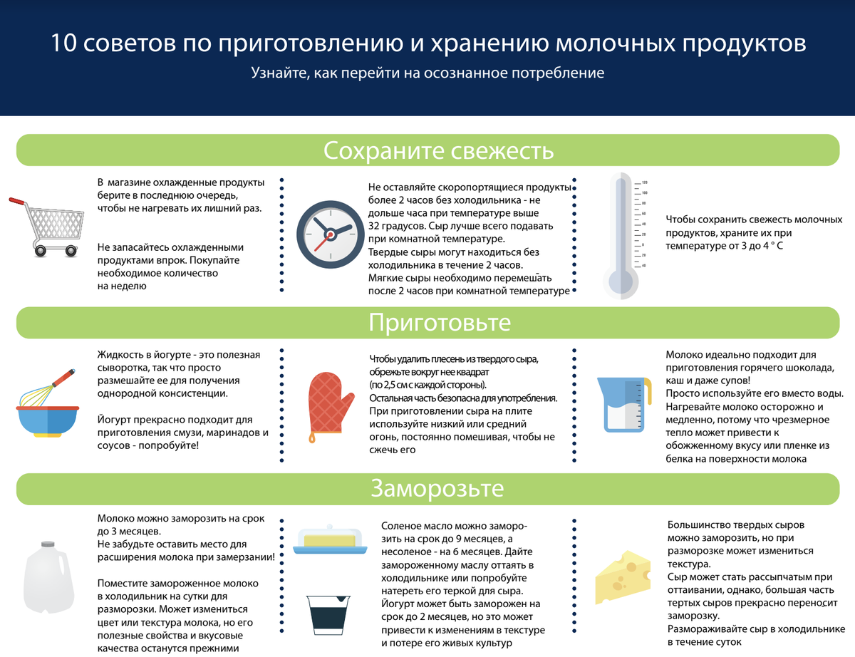 Сейчас все мы реже выходим из дома, делаем покупки про запас и забиваем холодильник продуктами питания. Как сохранить их пользу дольше? Американская ассоциация молочных продуктов подготовила памятку для потребителей. В ней раскрыты следующие вопросы: Давайте вместе сделаем первый шаг к осознанному питанию!