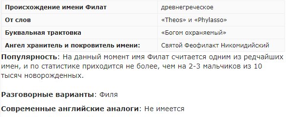 Мужское имя Филат однозначно имеет греческое происхождение. Было образовано от греческого словосочетания «Θεοφύλακτος», буквальная трактовка которого звучит как «Богом хранимый». Сегодня встречается достаточно редко. Этимологам удалось определить, что имя Филат наделяет носителя очень сильным и практичным характером, с некой долей противоречий. Считается, что все Филаты наделены такими качествами, как пунктуальность и расчетливость, планомерность и меркантильность, честность и осторожность, практичность и коммуникабельность, принципиальность и чувственность, любвеобильность и непостоянство. СМОТРИТЕ ВИДЕО - ПОДРОБНЕЕ ТУТ Источник - Значение имени Филат: карма, характер и судьба