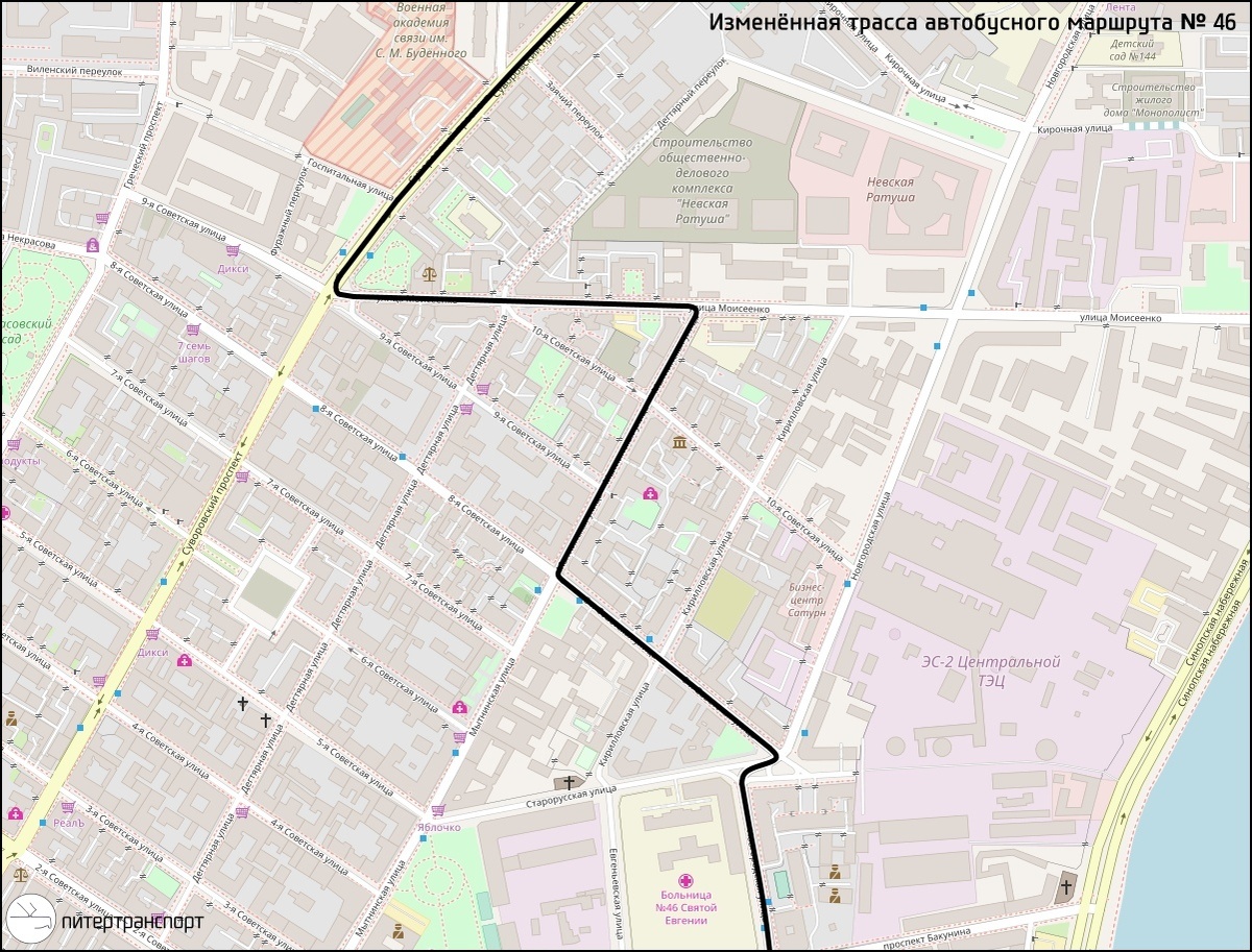 С 25 по 29 апреля, в связи с реконструкцией газопровода на улице Моисеенко (на участке от Новгородской ул. до Кирилловской ул.), вносятся изменения в трассу автобусного маршрута № 46.