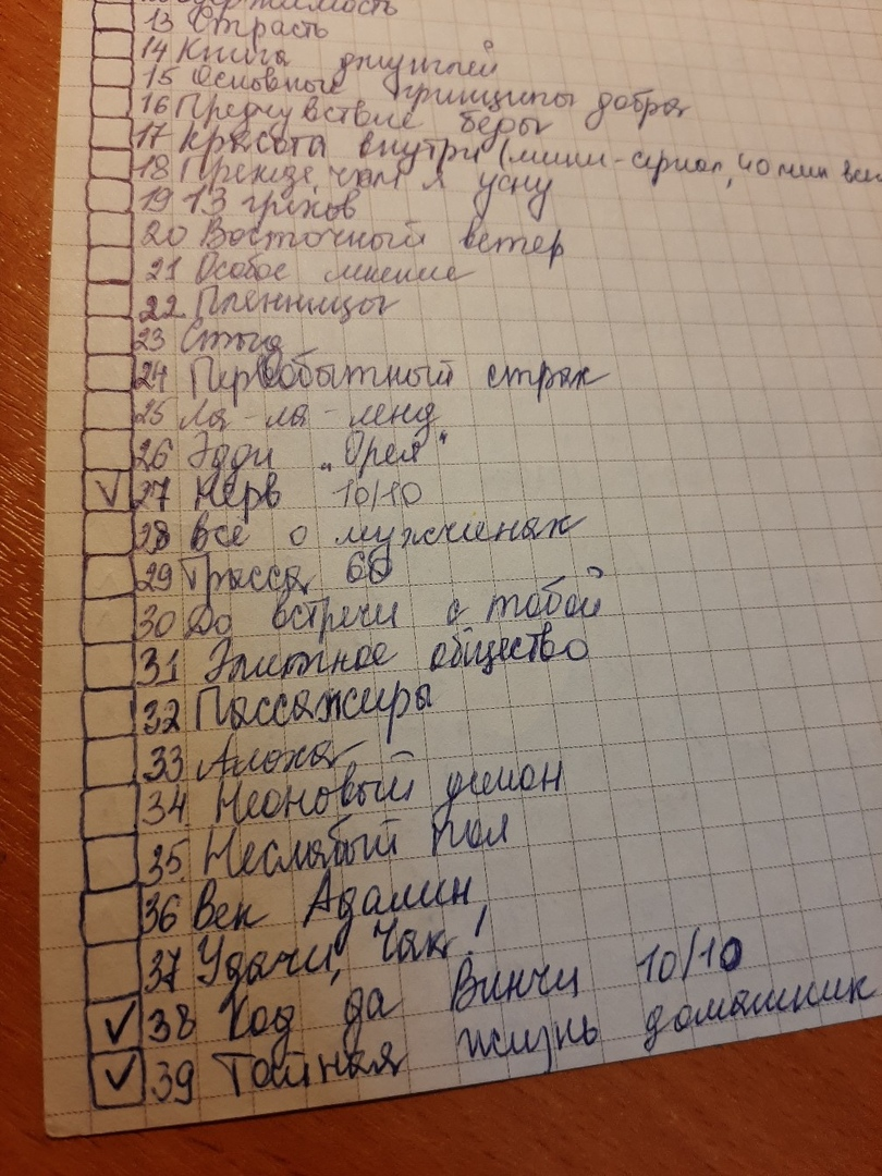 У вас бывало такое, что нужно было что-то сделать, но просто вылетело из головы? Либо в магазине ходите мимо разных прилавков, вспоминая, нужен ли был зелёный горошек, или в холодильнике стоит ещё 2 банки? Чтобы таких вопросов самому себе не задавать и не загружать голову большим количеством информации, легче всего записать всё, что нужно, на бумаге. Можно придумать сотню разных списков, записывая буквально каждый шаг. Но я привела 4 вида, которые помогут вам разгрузить голову и не копаться каждый раз в своей памяти. Оставьте место действительно важным и интересным вещам, память же не безгранична:) 1. Список фильмов (книг) У меня часто возникает ситуация, что смотрю какую-то подборку фильмов, и мне нравится кино по описанию. Сразу загорается лампочка "хочу посмотреть". Но, если я не запишу название, я через 15 минут могу забыть, какой сюжет описывает этот фильм, не то, чтобы его название. Поэтому в таких случаях я всегда веду записи: либо в телефон, либо на листок бумаги. Это помогает