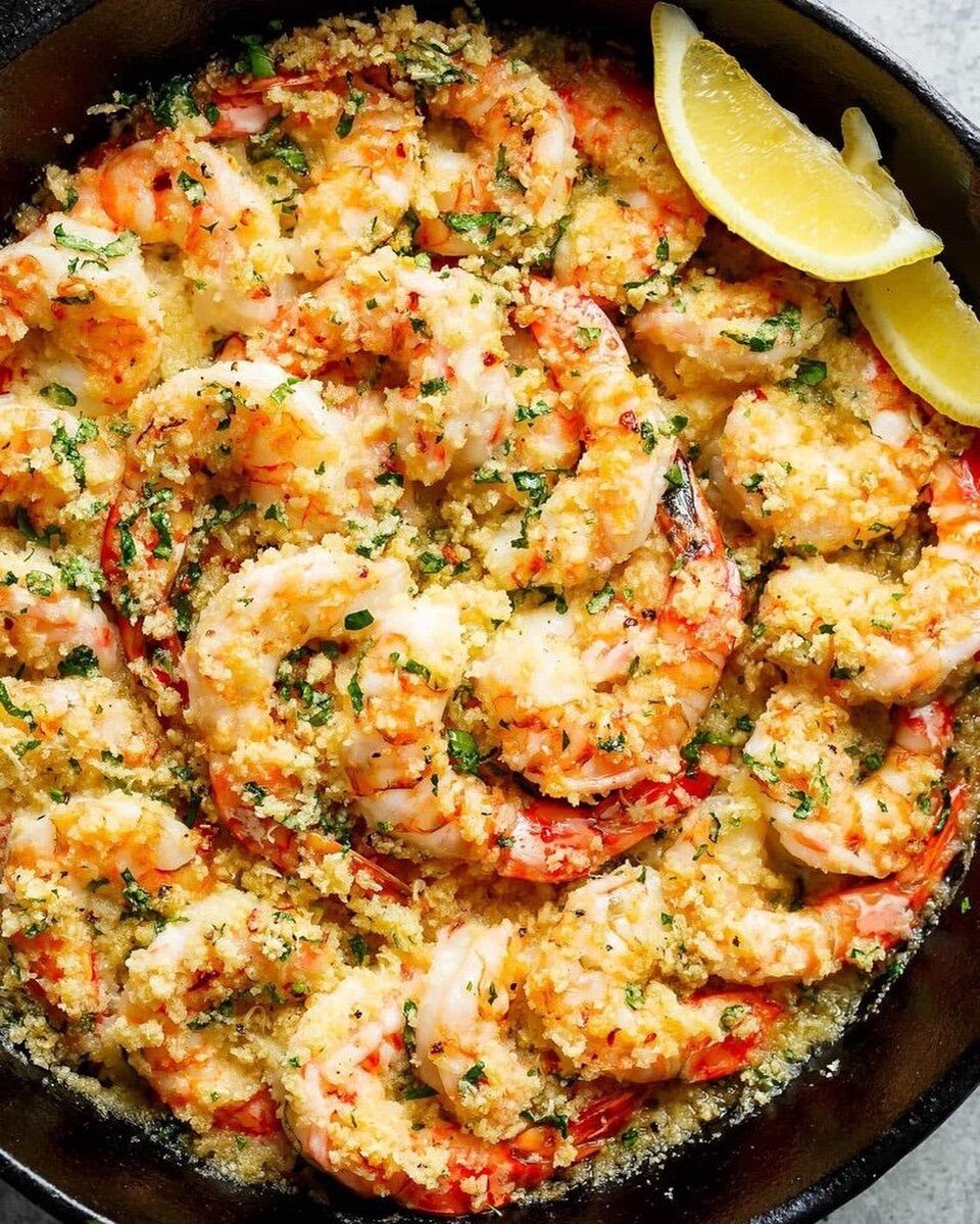 Ингредиенты: ⠀ ⠀ Приготовление: ⠀ 1. Разогрейте духовку до 220 °C. 2. Добавьте в форму для выпечки вино и лимонный сок и отставьте в сторону. 3. В маленькой миске смешайте панировочные сухари и сливочное масло. 4. В большой миске смешайте креветки, оливковое масло, чеснок. Добавьте соль и перец по вкусу. 5. Выложите креветок в форму для выпечки в один слой. 6. Сверху равномерно посыпьте смесью панировочных сухарей. 7. Отправьте в духовку и запекайте 10–20 минут, до золотисто-коричневого цвета. 8. Готовое блюдо по желанию украсьте мелко нарезанной петрушкой и дольками лимона. ⠀ Приятного аппетита!