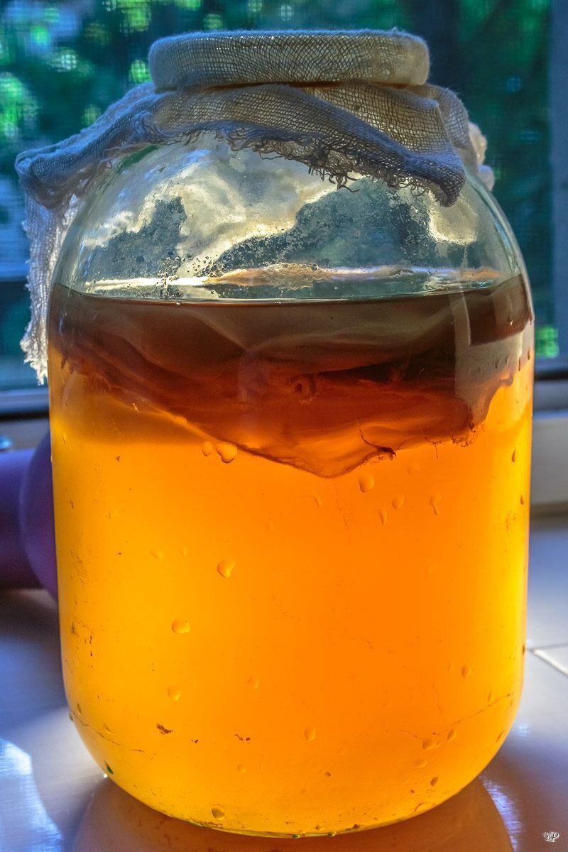 Чайный гриб это обобщающее название нескольких разновидностей симбиоза гриба с бактерией. И при помощи этого чайного гриба изготавливается кисло-сладкий газированный прохладительный напиток называемый чайным квасом. Да, да именно чайным квасом. Данный напиток используется в альтернативной медицине, однако его лекарственный эффект не доказан. Но я лично считаю, что такая экзотическая фигня, которая еще и в банке храниться, однозначно должна какими-то да лечебными свойствами обладать. Так вот, упоминания о чайном грибе в китайской истории датируются еще 220 годом до нашей эры, он был охарактеризован как "очищающий и наполняющий энергией напиток" . В Европу этот напиток попал с Российского дальнего востока в начале 20 века, через Россию в Германию и к началу второй мировой войны уже распространился по Европе. Кстати, этот гриб имеет обще европейское название "камбуча", это производное от какого-то Японского названия. Из чего состоит? Из чего же этот гриб состоит? Ну а на самом деле это н