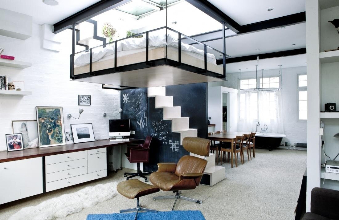 Этот необычный с первого взгляда дом в Лондоне мгновенно привлек наше внимание, и вы, наверное, догадались почему. Главное особенность проекта заключается в том, что кровать как бы зависла посередине гостиной комнаты. Это может быть не самое практичное решение, которое мы когда-либо встречали, но, безусловно, заслуживает достаточно высокую оценку в плане креативности. Комната для гостей может похвастаться так называемым творческим дополнением, а именно боковыми лестницами-стенами покрытые тканью используемые в качестве доски и окнами, размещенными в потолке, которые буквально проливают свет на парящую в воздухе спальную. А что касается рассматриваемой гостиной, то тут разработчики мудрить не стали и в основном использовали стандартные встроенные в потолок светильники. Цвет является одним из двигателей данного проекта, добавляя динамики в небольшие места. В то время как все стены выкрашены в белый цвет для того, чтобы увеличить визуально пространство, а смелые оттенки были использова