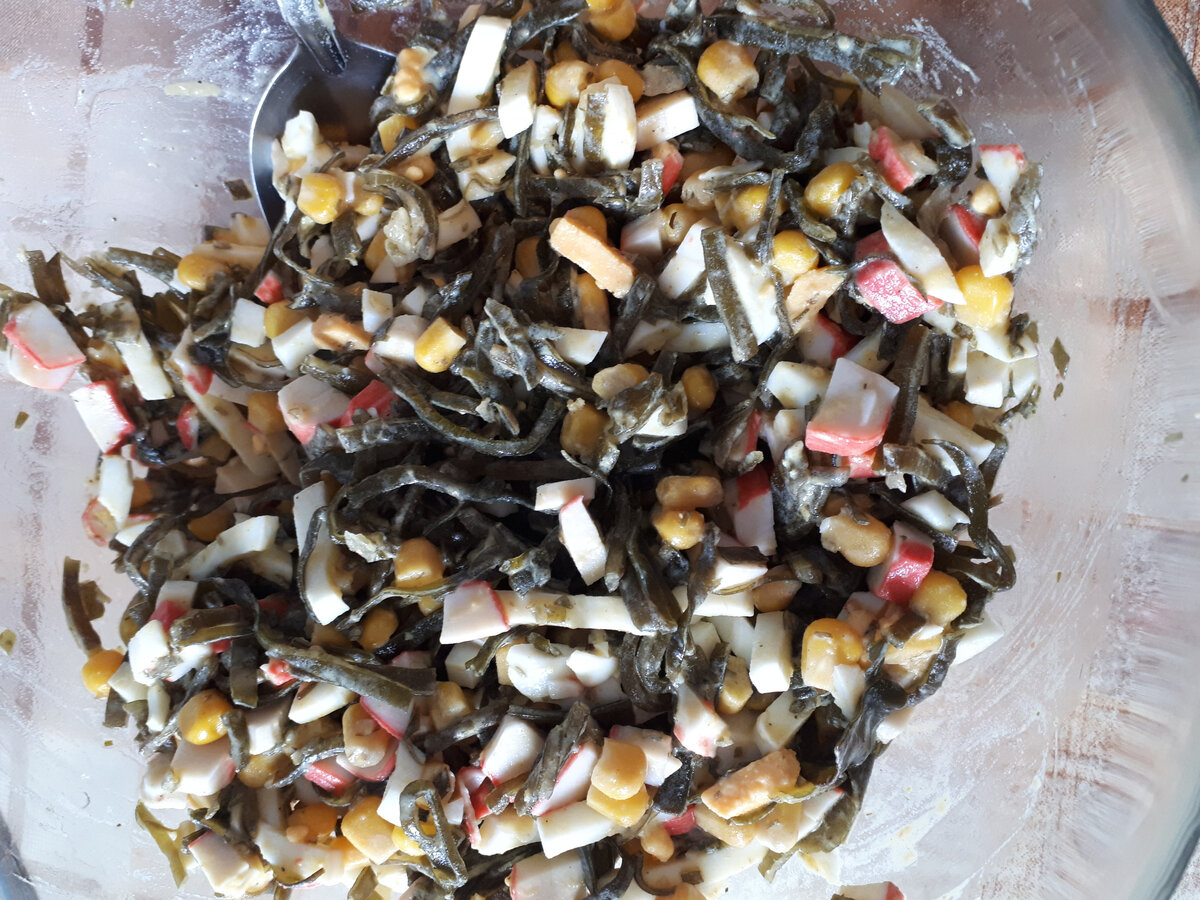 Есть морскую капусту не всегда интересно без ничего, просто так, из банки, поэтому мы решили преобразовать ее в полноценный салат. Добавили кукурузу, крабовые палочки и пару вареных яиц. Даже без заправки какой-либо, без соуса. Та заправка из масла, которая идет в комплекте с капустой, очень хороша. Приятного аппетита! Если у кого есть идеи других салатов из морской капусты - добро пожаловать в комментарии.