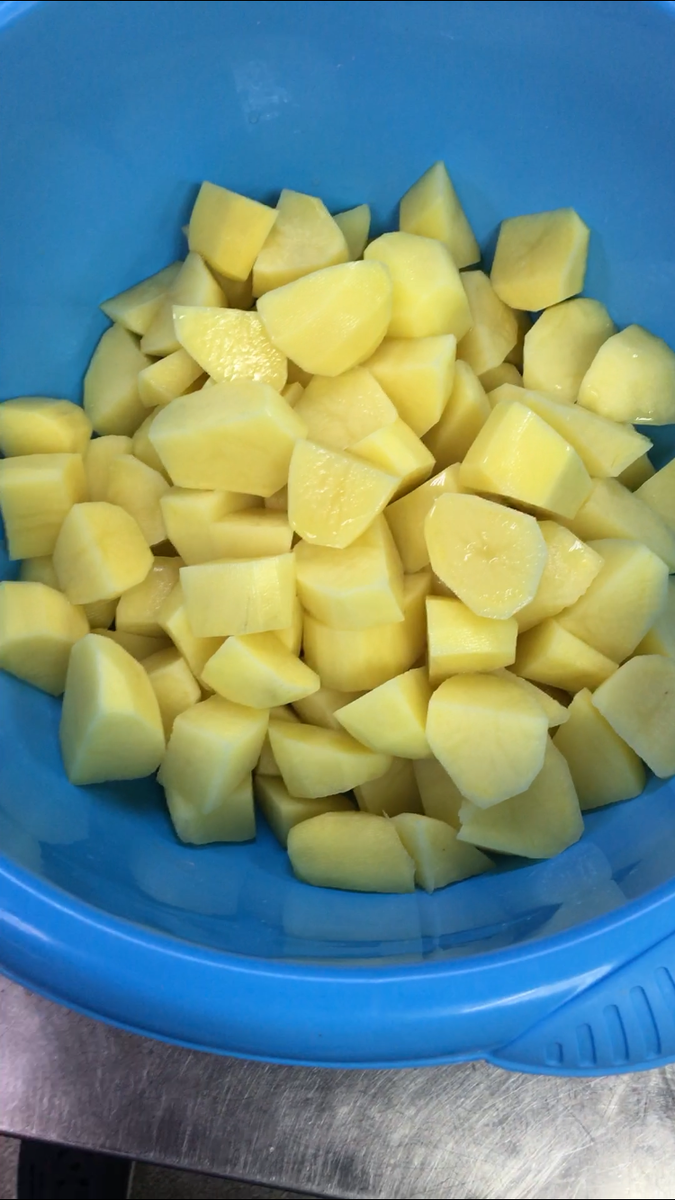 Действительно, пюре уже надоело, хотелось чего то плотного. Мне зубы не для пюре природа дала, и решил я разнообразить сам картофель как гарнир. В духовке под фольгой, всё получается потрясающе: рыба, мясо, овощи. И меньше, как ясчитаю канцерогенов. Перед началом приготовления, обязательно убедитесь в наличии фольги. Поскольку я был на работе, фольга у меня всегда лежит два рулона, а вот дома заканчивается периодически, и в самый не подходящий момент. Сколько раз бывало, начнёшь готовить, уже всё подготовлено, глядь, а фольги нет. И уже не хочется бежать в магазин. Собственно начнём! Картофель отчищаем от кожицы, и нарезаем крупным кубиком. Главное чтобы у вас была глубокая миска (полусфера) или тазик. Подготовьте, чтобы все предметы, и специи стояли рядом. Я перемешивал руками, и мне пригодилось то, что всё в зоне досягаемости, а то можно потом всё руками уделать. Дальше добавляем специи: Можно и без чесночного масла, а чеснок натереть на тёрке, ну или нарезать. Обязательно
