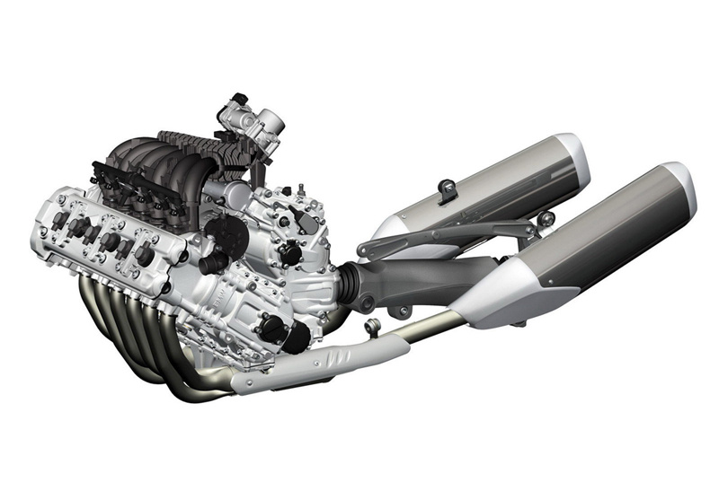 Ни одного пятицилиндрового мотоциклетного мотора мне что-то на ум не приходит, поэтому перейдем к рядной "шестерке". Шесть цилиндров в ряд, да еще расположеных, как и у всех рядных двигателей, поперек мотоцикла - это впечатляет! Характеристики такого мотора уже вполне автомобильные: объем 1600 куб. см. и мощность более 160 сил. Понятно, что такой агрегат может быть установлен только на какой-нибудь огромный мотоцикл. Например, на BMW K 1600 GT - большой туристический мотоцикл, предназначенный для очень дальних прохватов по хорошим европейским дорогам. Здесь использование сложной в реализации шестицилиндровый схемы было вызвано прежде всего желанием получить огромный крутящий момент при очень низких паразитных шумах и вибрациях. Получилось. Любой инженер знает, что рядные "шестерки" - самые сбалансированные двигатели! Идти дальше вширь уже некуда, поэтому от "рядных" схем построения двигателя перейдем к более редким и, на мой взгляд, более интересным конструкторским решениям. На картинк