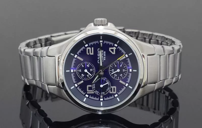 Современная модель мужских кварцевых часов из знаменитой линейки Casio Edifice имеет яркий синий циферблат, акцент сделан на жёлтый наконечник секундной стрелки. Классические часы обладают высоким показателем водостойкости WR100, что относит их к разряду аксессуаров для плавания. В них можно даже нырять, но только на небольшую глубину до 3 метров.