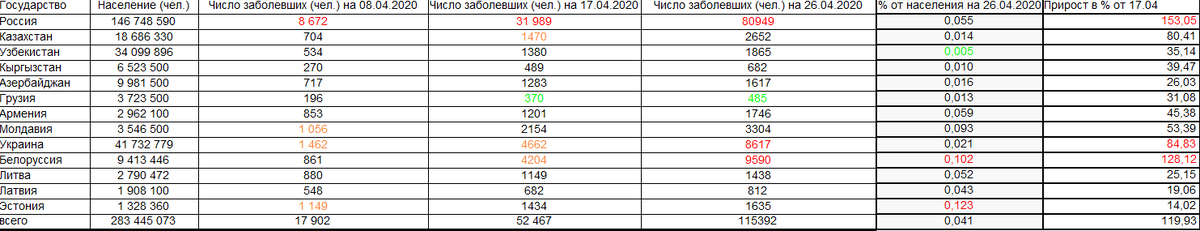 Доброго времени суток, дорогие читатели. За окном конец апреля, все уже зеленеет, но при этом самоизоляция продолжается. Постепенно происходит смягчение самоизоляции: разрешается ездить на дачи, передвигаться по городу, но при этом имея соответствующий документ. Недавно я поднимал данную тему на своем канале. Однако прошло больше недели с момента последней публикации. Многие скажут это небольшой период времени. Но при этом цифры достаточно поменялись. Давайте взглянем на последние изменения, по сравнению с прошлой неделей. В сравнении с прошлой неделей мы видим довольно глобальные изменения. Общее количество заболевших в целом по странам превысило 115 тысяч. Это более чем в 2 раза по сравнению с показателями 17.04.2020. Лидером является РФ. Прирост составил 153%. Почти 81 тысяча человек. Далее идут Белоруссия и Украина. Там показатель поскромнее - менее 10 тысяч в каждой. Прирост 128% и 84% соответственно. Однако % заболевших от населения довольно высокий - 0,1. Выше только в Эстонии