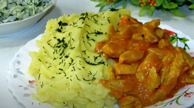 Сегодня приготовим вкусное мясное блюдо «Бефстроганов в соусе» и выручит нас курятина! Готовится блюдо очень быстро, получается вкусно, нежно и красочно. Начнем с мяса. Филе куриной грудки разрезаем на два три плоских кусочка и нарезаем их соломкой. Вот что у нас получилось! На сковороду наливаем 3 столовые ложки растительного масла, разогреваем его и выкладываем мясо. В мясо кладём по половине чайной ложки: соль, перец, сушеный чеснок, паприку, приправу карри, она отлично сочетается с курицей. Обжариваем филе пять минут помешивая. Тем временем нарежем лук вот такими кусочками. На крупной терке натрем морковь. Добавим лук к филе, 3- 4 минуты обжарим их вместе, а затем добавим морковь и обжарим еще 3-4 минуты. Теперь, чтобы загустить соус, кладём одну столовую ложку без горки муки, перемешиваем и добавляем 200 миллилитров томатного сока. Нет его, возьмите 2 столовые ложки томатной пасты и разведите её в стакане воды. При перемешивании соус сразу загустеет это- то нам и надо. Е