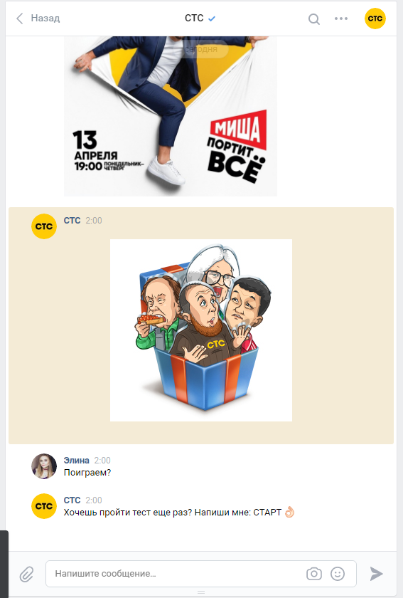 Доброго времени суток друзья, не для кого не секрет что некоторые компании сотрудничают с вконтакте, и эти компании бесплатно раздают стикеры вконтакте, делается это в основном для привлечения внимания пользователей к их компании, бродя по интернету я нашёл способ как получить стикеры вконтакте от канала "СТС" и так приступим, делать почти не чего не нужно, надо ответить лишь на 3 вопроса, если вы ответите не правильно то всегда можно начать сначала! Переходим по ссылке "СТС" Пишем в чате "Поиграем?" Бот вам будет задавать вопросы а вы на них должны ответить всё очень просто, спасибо всем за внимание, если данная статья вам была интересна то поставьте лайк и подпишитесь, халявы будет много я обещаю!