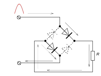 Рассмотрим еще один популярнейший элемент электрической схемы - диодный мост. Широко используется в качестве выпрямителя переменного сигнала. Выводы входного сигнала обозначены AC, выход соответственно + и- . Диоды здесь подключены таким образом, чтобы ток нагрузки, подключенной к выходу не менял своего направления.