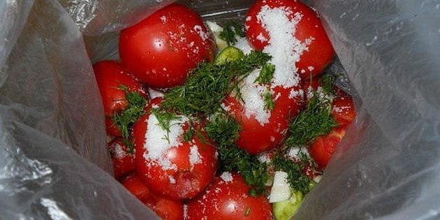 Потратьте полчаса, подождите пару дней (а то и меньше) — и малосольные помидоры с хреном или чесноком и зеленью, в рассоле или в собственном соку будут готовы. Общие рекомендации 1.Малосольные помидоры в пакете В пакете помидоры солятся в собственном соку, поэтому надрезы на овощах нужны обязательно. Этот способ засолки занимает 2–3 дня. Но если добавить яблочный уксус или лимонный сок, процесс пойдёт быстрее. Ингредиенты Приготовление Помойте и просушите помидоры. Вырежьте у них плодоножки, а с обратной стороны сделайте неглубокие крестообразные надрезы. Сложите томаты в чистый полиэтиленовый пакет. Добавьте к ним соль, сахар, измельчённый чеснок и зелень. Кроме укропа, можно использовать петрушку или базилик. Плотно завяжите пакет и аккуратно встряхните, чтобы все ингредиенты хорошо перемешались. Чтобы выделившийся сок точно не вытек, положите овощи в кастрюлю или наденьте на них ещё один пакет. 2–3 дня храните помидоры при комнатной температуре. Когда просолятся, переложите в конт