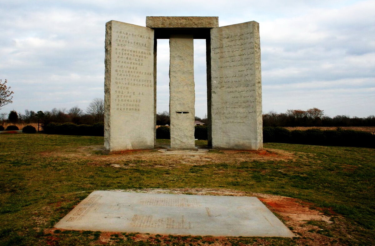 В округе Элберт, штат Джорджия, США, находится монумент высотой более 6 метров и состоит из шести гранитных блоков общим весом около 100 тонн. Он называется Скрижали Джорджии или Американский Стоунхендж. В предыдущей статье Кто нами управляет: Реальность мы уже говорили о некой мировой верхушке, которые являются «хозяевами истории». Но мир многогранен, он слишком велик и сложен для того, чтобы им управляли из одного центра. К тому же в противовес мировой верхушке в настоящее время на арене появились новые игроки. Они не вхожи в круги старой европейской аристократии, но они уже объединились и вступили в игру за мировое господство. Именно они хотят ввести "Новый мировой порядок". Четыре плиты монумента Скрижали Джорджии ориентированы в полном соответствии с годичным циклом перемещения по небосводу Солнца. Центральная, пятая, плита имеет отверстие, сквозь которое всегда видна Полярная звезда, и второе, выровненное с моментами равноденствиями и солнцестояниями. В шестой плите, лежащей све