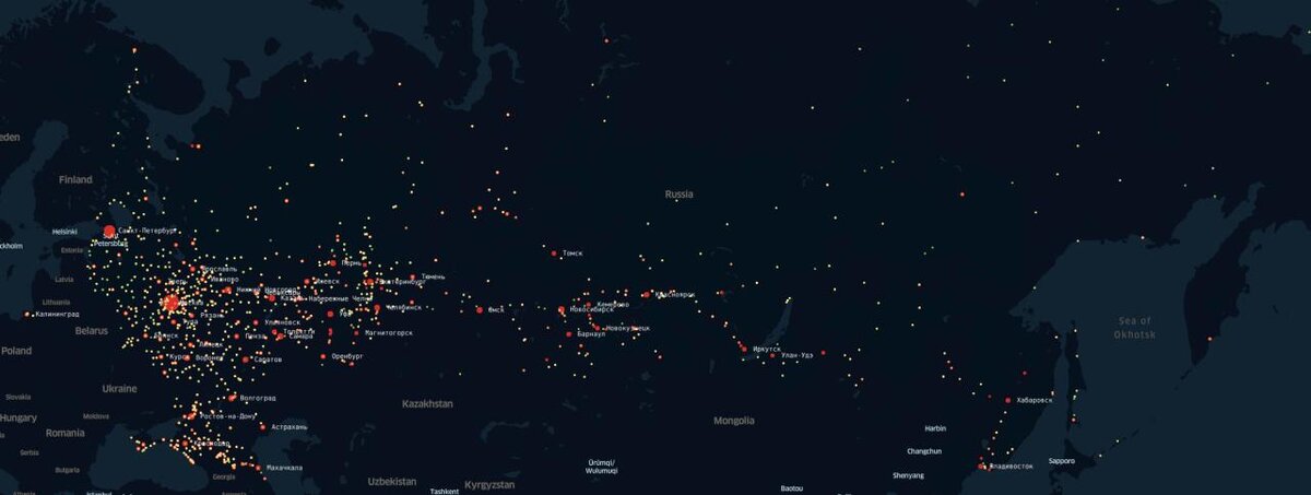 - На карте не отображаются города, где нет ни одного заболевшего. Поэтому если город появился — значит там кто-то заболел.