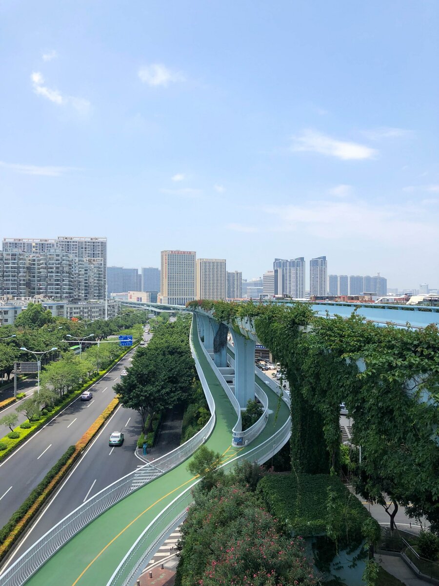 Пешеходная дорога выводит к двум башням Shimao Straits Towers. В них расположены квартиры, офисы и отель Conrad Xiamen. Сделав невозмутимый вид, мы поднялись на верх в лобби отеля, откуда открывается вид на залив и остров Гуланъюй.