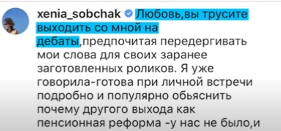 На днях Ксения Собчак оставила развернутый комментарий под постом Любови Соболь с «5 шагов для России». Вчера Любовь Соболь выпустила видео с опровержением высказываний Собчак о, якобы, страхе участвовать в дебатах. Напротив, Соболь напомнила о февральском инциденте, когда она согласилась на дебаты с Собчак, и телеканал Дождь уже вел переговоры. Соболь выдвинула лишь пару условий: заранее оговоренный регламент, нейтральный ведущий и то, что Ксения сама вызовет Соболь, раз первая так рвется. После этого тема с дебатами затухла. Обвинив Собчак во вранье, Соболь также добавила, что Ксения мешает тому, чтобы люди получали поддержку от государства. Штаб Навального призывает дать «всего лишь по 20 000 рублей», но Собчак упорно говорит о невозможности принятия таких мер. Она отстаивает официальную позицию, говоря, что реализация таких условий нереальна. Соболь же готова участвовать в дебатах, отстаивая свою позицию, приводя аргументы в пользу этих решений. Любовь «готова бороться за пр