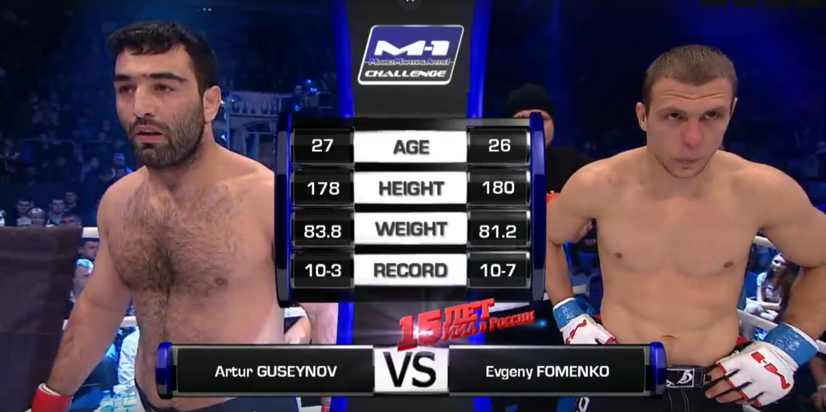 Всем привет. Сегодня расскажу про поединок с участием бойца из Дагестана Артура Гусейнова по прозвищу "Торнадо" и бойца из Украины Евгением Фоменко. Артур является чемпионом Азии по боям без правил, чемпионом России по боевому самбо, чемпионом России по кикбоксингу, а его рекорд на момент поединка был 10-3. Про заслуги его соперника не известно, но в профессионалах провел больше боев и имел рекорд 10-7 и является базовым борцом. Поединок прошел на турнире M-1 Challenge 36. Ход поединка Артур сходу нанес два плотных лоу-кика по внутренней части бедра, но после второго удара Фоменко смог без труда перевести Гусейнова в партер. Евгений смог нанести пару ударов в голову в пратере, однако Артур хорошо связал ему руки, не позволяя ему наносить подобные удары. Рефери не стал долго ждать, пока Фоменко выпустит руки из захватов и поднял спортсменов в стойку. Тут Артур решил показать зрителем, за что ему дали прозвище "Торнадо". Сначала он решил пробить хай-кик, но попал по защите, но после Гус