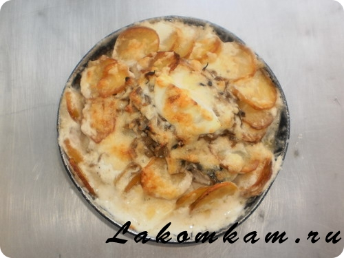Блюдо из рыбы «Рыба запечённая с грибами в сметанном соусе по-московски». Ингредиенты: картофель 200 грамм; скумбрия 1 штука; 3 свежих шампиньона; мука для панировки; 1 луковица; четвертинка варёного яйца; сыр твёрдых сортов — 10 грамм; соль по вкусу. Для соуса: 100 грамм сметаны; мука — 50 грамм; 100 грамм бульона.