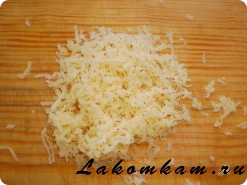 Блюдо из рыбы «Рыба запечённая с грибами в сметанном соусе по-московски». Приготовление. Сыр натираем на мелкой тёрке.