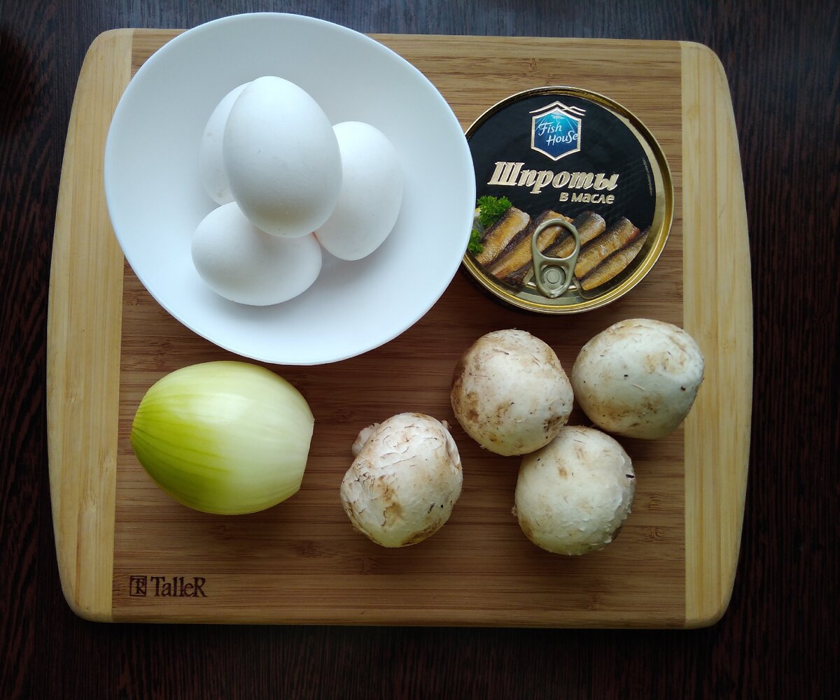 Яйца и обжаренные грибы не имеют ярко выраженного вкуса, они прекрасно дополняют вкус шпрот. А хрустящие сухарики придают особую текстуру этому салату.