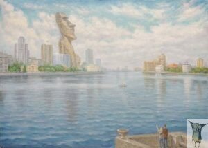 Виталий Заозёрский Загогулина 50×70 хм 2019 г 40 000 Вот как ответил художник Виталий Заозёрский на вопрос: “Быть или не быть храму на месте сквера?” Картина появилась в начале года, и художник не предполагал остроту задеваемой им темы. И сейчас, если его спросить, какая муха его осенила именно в это место поставить две статуи острова Пасхи, вряд ли он вразумительно сможет нам объяснить мотив, толкнувший его на этот городской пейзаж явно постмодернистской направленности. До этого я уже видел две картины из такой ненавязчивой игры воображения художника. Примерно на этом же месте городского пруда случился “девятый вал Айвазовского”, или” бредущие охотники на снегу Брейгеля” вдоль по набережной Исети недалеко от резиденции представителя президента по Уральскому Федеральному округ. При случае мы обязательно рассмотрим и эти две картины, тем более, что мы сделали Заозёрскому заказ нарисовать картину падающей недостроенной башни а-ля Брюллов на фоне Последнего дня. Случайна эта рифма ил