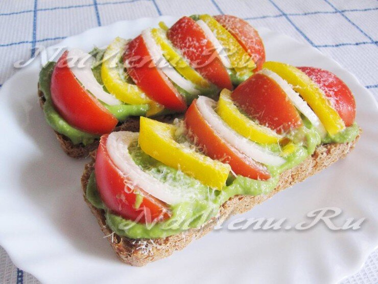 Ингредиенты: ✔️2 кусочка хлеба, ✔️половинка авокадо, ✔️2 помидора, ✔️1 сладкий перец, ✔️половинка луковицы, ✔️зубчик чеснока, ✔️соль, ✔️0,5 ст.л. лимонного сока, ✔️сыр (по желанию). 🍞Хлеб немного подсушим в тостере. Если тостера нет, то можно поджарить хлеб на оливковом масле 🍅Промоем помидоры, перец очистим от семян, у авокадо удалим косточку и срежем кожицу 🥑Мякоть авокадо порежем крупно, добавим соль, чеснок и лимонный сок. Взобъем погружным блендером 🧅Порежем лук полукольцами, перец полосками. Помидоры разрежем на 4 части, удалим жидкость и семена. Разрежем помидоры на дольки 🥄Намажем хлеб слоем пасты из авокадо. Выложим нарезанные овощи поверх пасты, чередуя их по цвету 🧀Посыпем бутерброды сверху тертым сыром. Поджарим бутерброды на масле, накрыв крышкой https://namenu.ru/3021/Goryachie_buterbrody_s_avokado_i_ovowami/