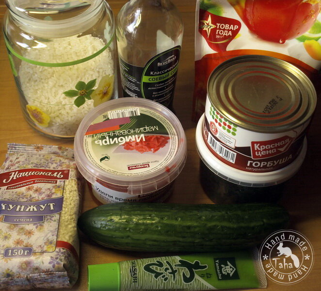 Рецепт, который предлагаю, мне практически приснился. Рассказала мужу, и мы немедленно пошли в магазин за недостающими продуктами. Не только моя заслуга в этом рецепте, муж тоже внес свою лепту, за что ему огромное спасибо. Подобных салатов много, но большинство из них дорогие, сложные и даже не очень вкусные. Я все упростила и получила гениальный результат! Нам понадобится: Для заправки: Для подачи: Рис отварим до готовности, откинем на сито и промоем. Рис при варке надо посолить, но совсем немного, соли в салате итак будет достаточно. Огурец порежем соломкой или натрём на крупной тёрке, имбирь измельчим ножом. С капусты сольём рассол, можно немного её отжать. Рыбу достанем из банки, удалим кости и слегка разрыхлим вилкой, мельчить не будем, при перемешивании она сама распадётся. Смешаем в салатнике рис, морскую капусту, огурец, имбирь и рыбу. Для заправки в отдельной ёмкости смешаем соевый соус, васаби и майонез. Заправим салат и обязательно пробуем, при необходимости балансируем
