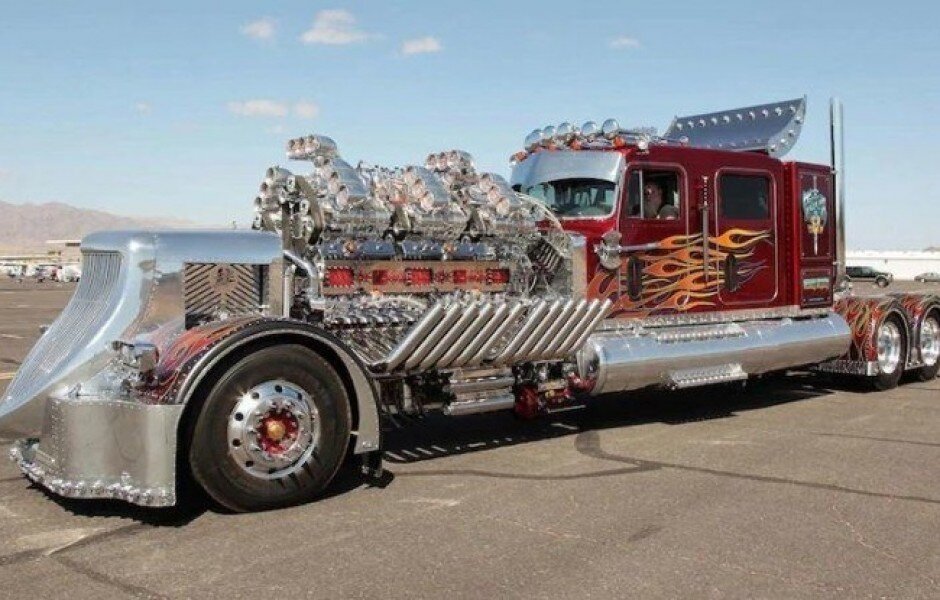 Застройщик из Южной Калифорнии Майк Харра потратил семь лет на постройку тягача THOR 24 с огромным 27,9-литровым двигателем. Сейчас машина стоит в авиационном ангаре на окраине городка Лейк-Хавасу-Сити, штат Аризона, США. Тягач Харры построен на базе грузовика Peterbilt 359 образца 1979 года. Он оснащен двумя спаренными дизелями 12V-71 от Detroit Diesel, дополненными восемью компрессорами BDS 8-71. Так как в стоке у каждого двигателя уже есть механические нагнетатели, то общее их количество достигает двенадцати. Рабочий объем чудо-мотора — 27,9 литра. Длина приводного вала, раскручивающего компрессоры — больше двух с половиной метров. Впускной коллектор изготовлен из тонкой алюминиевой пластины, а на его верхушке установлены восемь баллонов с закисью азота. Выхлопных патрубков — 24 штуки. На 2500 оборотах в минуту 24-цилиндровый дизель выдает 3471 лошадиную силу. Тяга передается на задний мост через четырехдиапазонную автоматическую коробку передач Allison HT740. В длину THOR 24 насчит